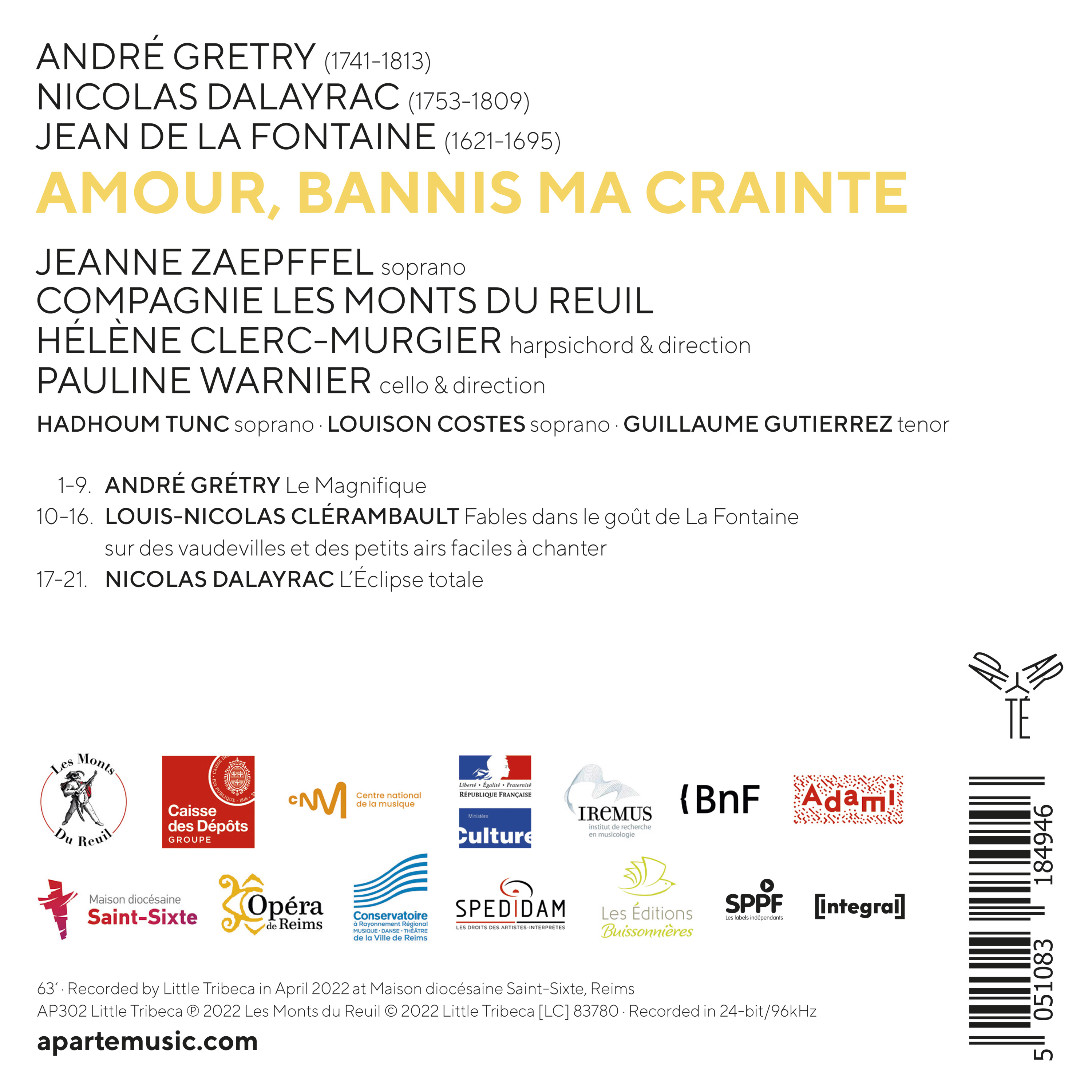 Compagnie unique en son genre, au carrefour de l’art musical, lyrique et théâtral, Les Monts du Reuil s’est fait une spécialité des trésors oubliés de l’opéra français. Elle conçoit ici un programme d’une absolue rareté autour des fables de La Fontaine, exhumant deux opéras-comiques s’appuyant sur le travail du fabuliste : Le Magnifique d’André Grétry et L’Éclipse totale de Nicolas Dalayrac, reconstitué pour l’occasion et enregistré pour la première fois. Sélectionnant les extraits les plus savoureux, piochant çà et là une ariette, un duo ou une fanfare “des courses”, les musiciens donnent à entendre toute le raffinement, la légèreté et la drôlerie du savoir-faire lyrique français de l’époque.