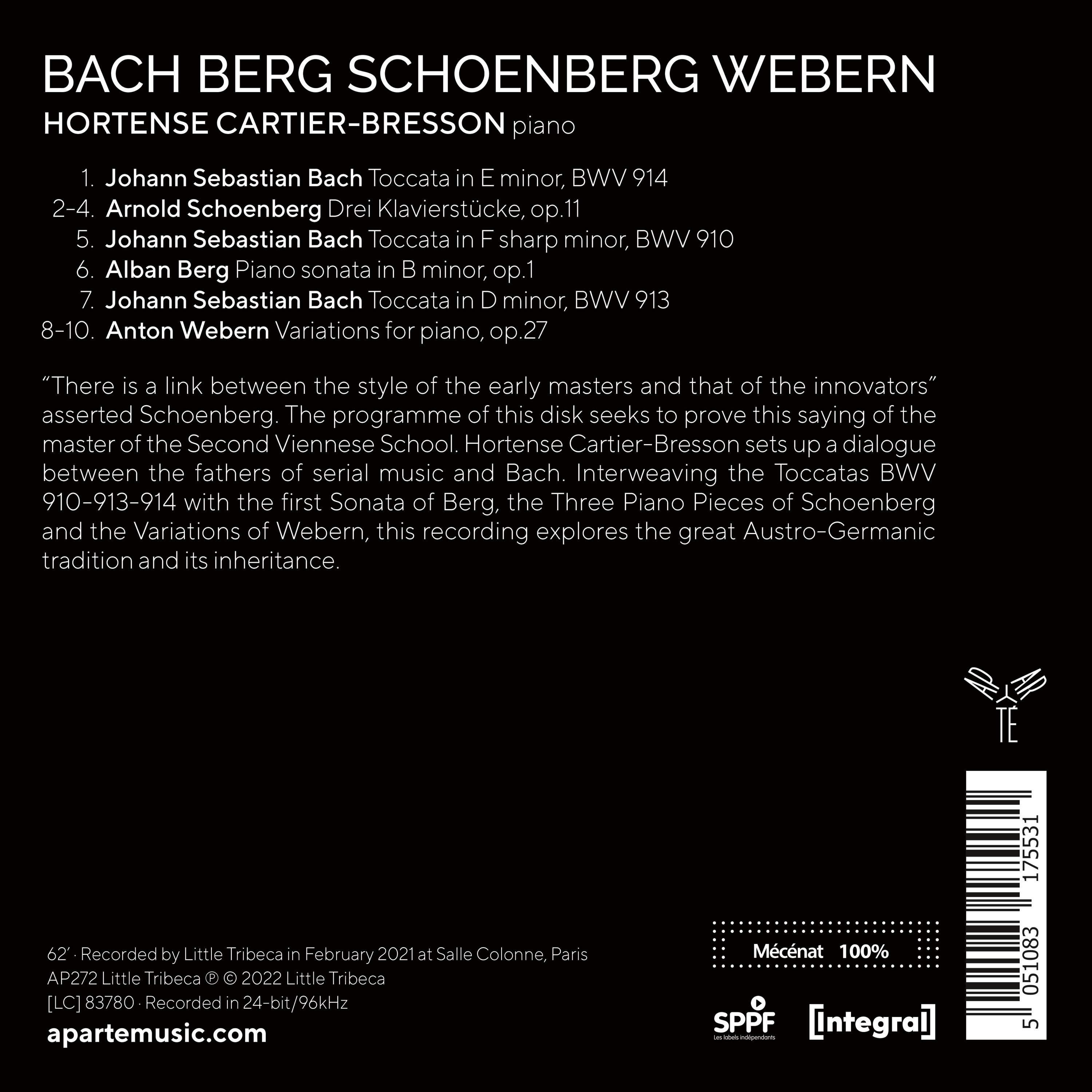 Hortense Cartier-Bresson fait dialoguer les pères de la musique sérielle avec Bach. Entrelaçant les Toccatas BWV 910-913-914 avec la première Sonate de Berg, les Trois pièces de Schönberg et les Variations de Webern, cet enregistrement explore la grande tradition austro-germanique et ses filiations.