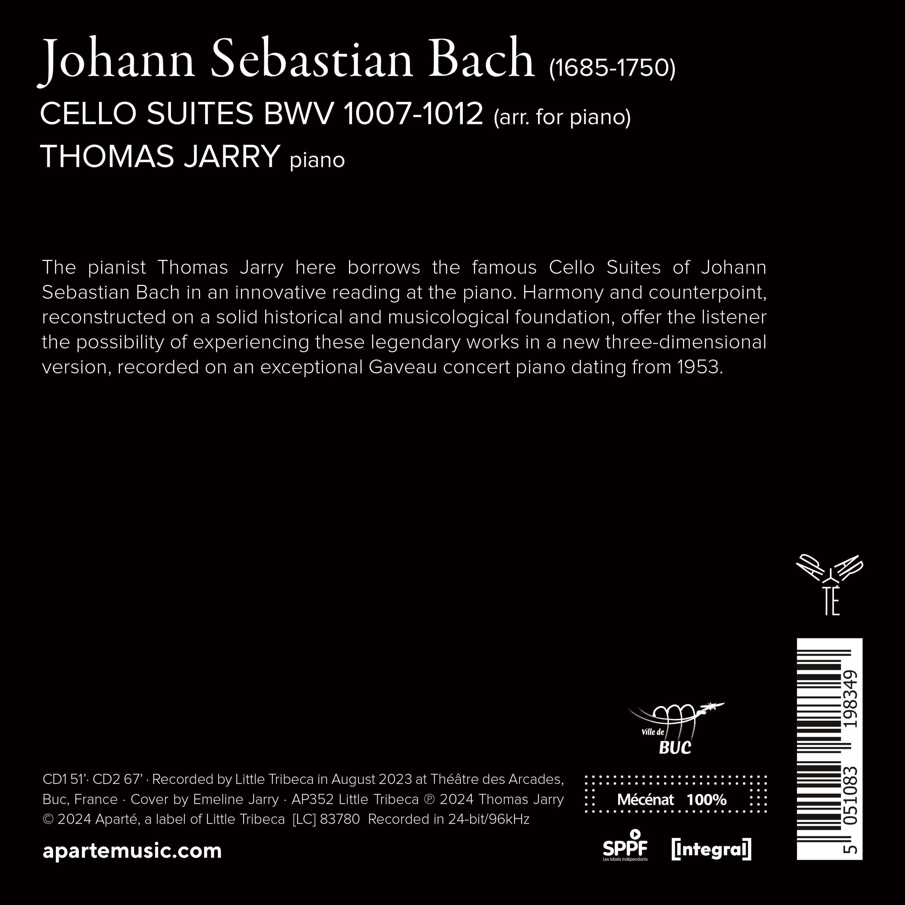 Le pianiste Thomas Jarry emprunte aux violoncellistes les célèbres Suites de Jean Sébastien Bach dans une approche inédite au piano. L’harmonisation et le contrepoint, recréés sur de solides bases historiques et musicologiques, offrent à l’auditeur une nouvelle écoute en trois dimensions de cette œuvre mythique.