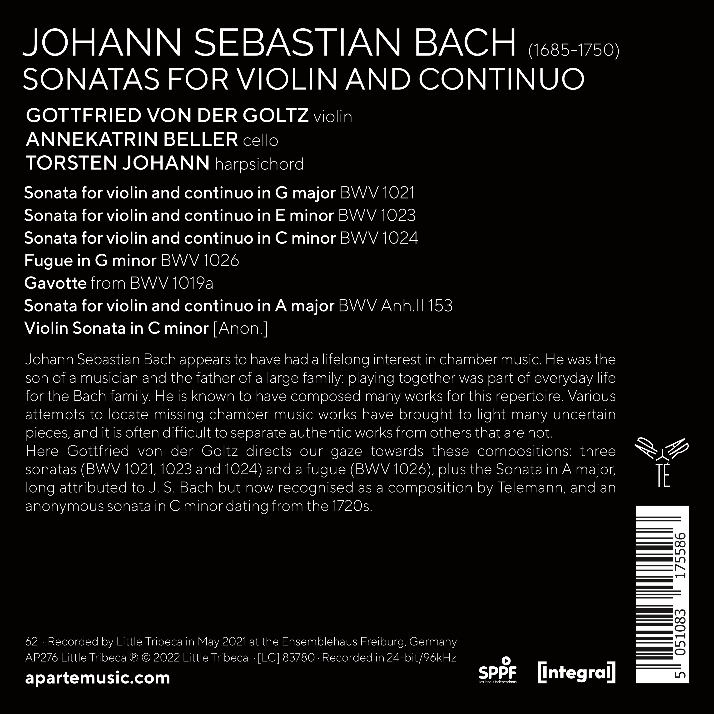 Gottfried von der Goltz réunit ici certaines de ces pièces atypiques et plus méconnues, comme les sonates pour violon et continuo BWV 1021, 1023, 1024 et la Fugue BWV 1026, que nous redécouvrons ici avec joie. L'enregistrement comprend également la Sonate en la majeur longtemps attribuée à Bach, mais depuis rattachée à la production de Telemann, ainsi qu'une sonate en do mineur anonyme, datant des années 1720.