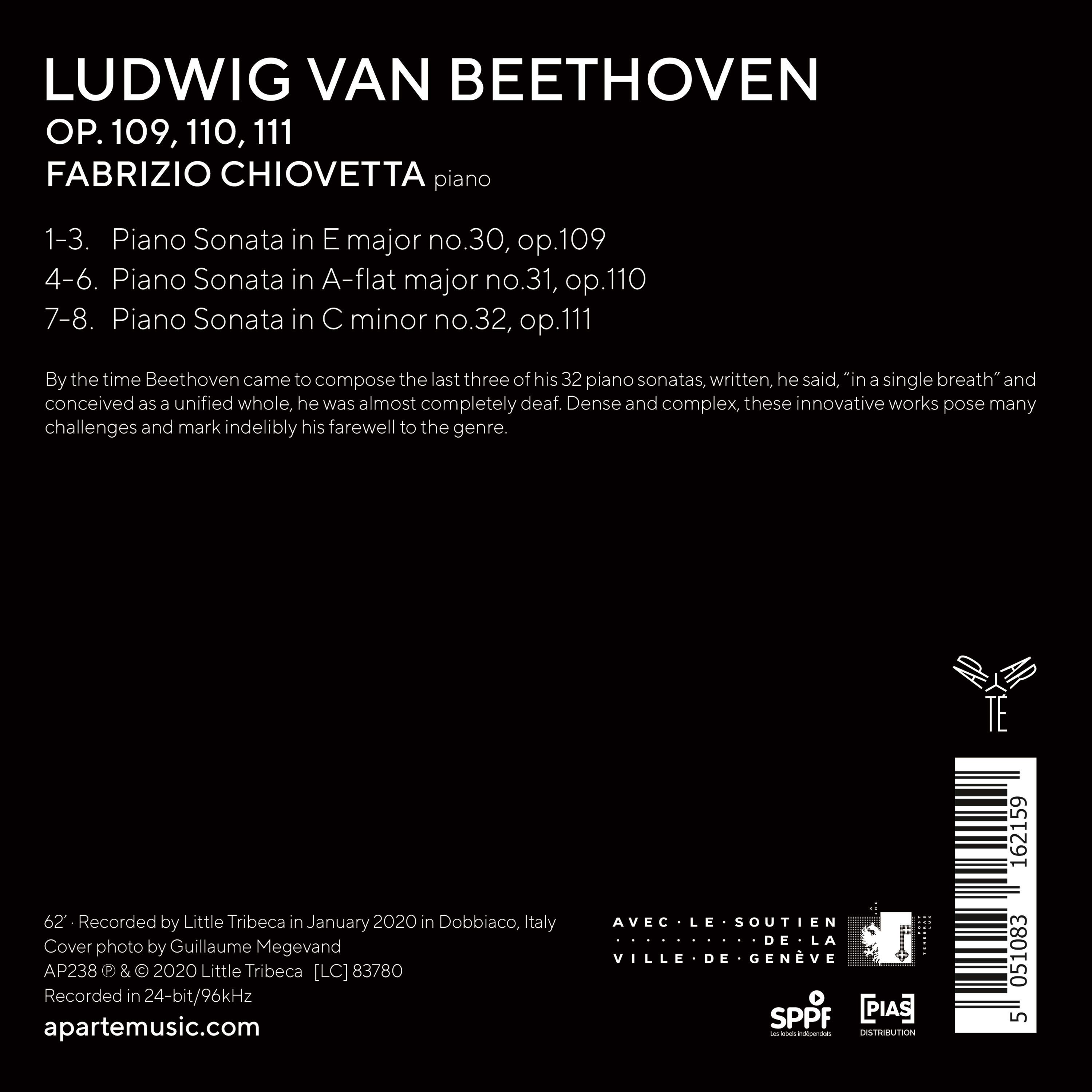 Les opus 109, 110 et 110 constituent les dernières œuvres pour piano de Beethoven. Fabrizio Chiovetta explore ici l’« adieu à la sonate » d’un Beethoven alors devenu presque sourd, entre furieux éclats et ultime apaisement : à son crépuscule, le compositeur se montre plus libre que jamais.