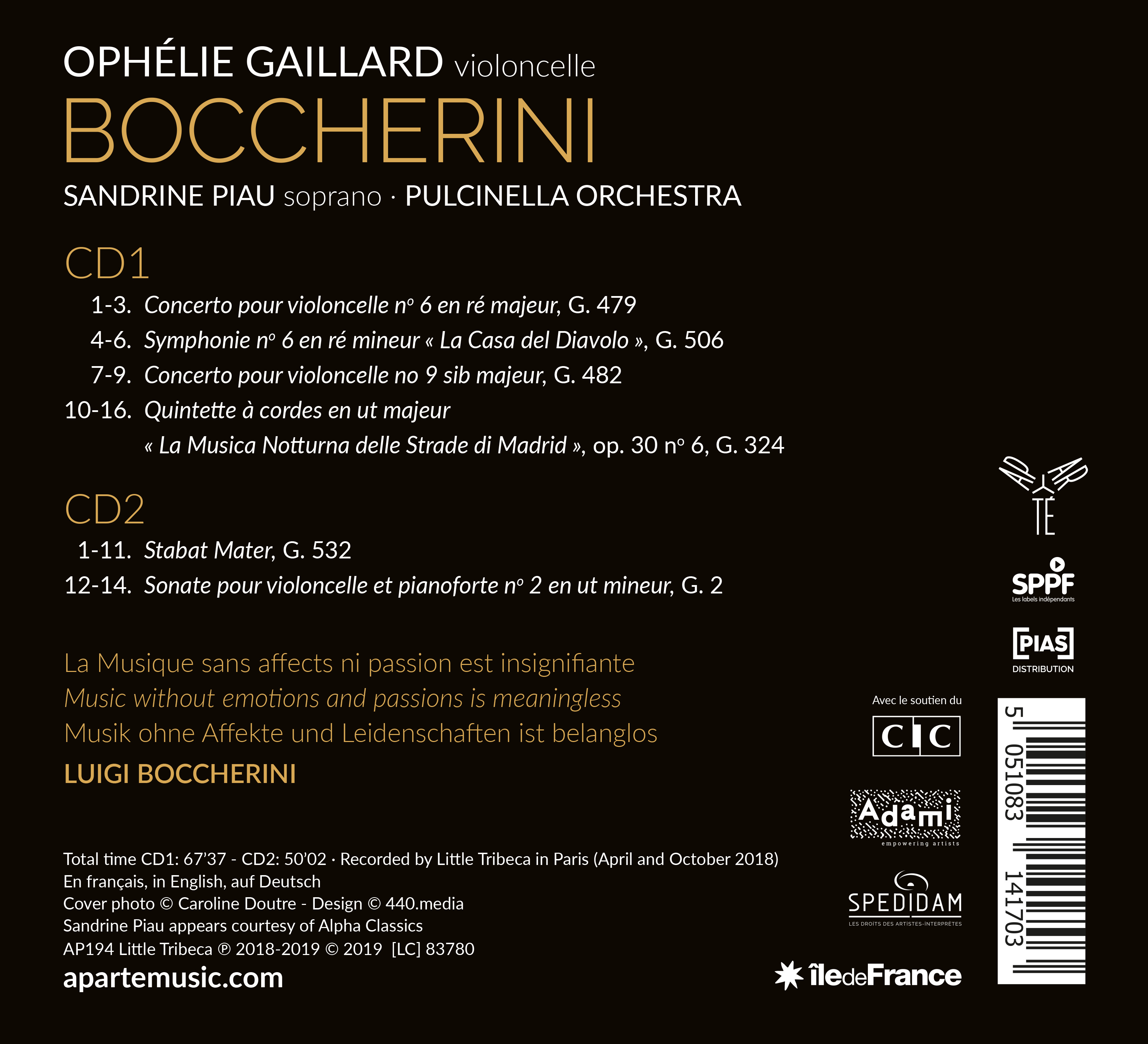 Tout comme les Suites de Jean Sébastien Bach, les partitions de Boccherini donnent à l’instrument ses lettres de noblesse. Il est au violoncelle ce que Vivaldi fut, une génération avant lui, au violon.