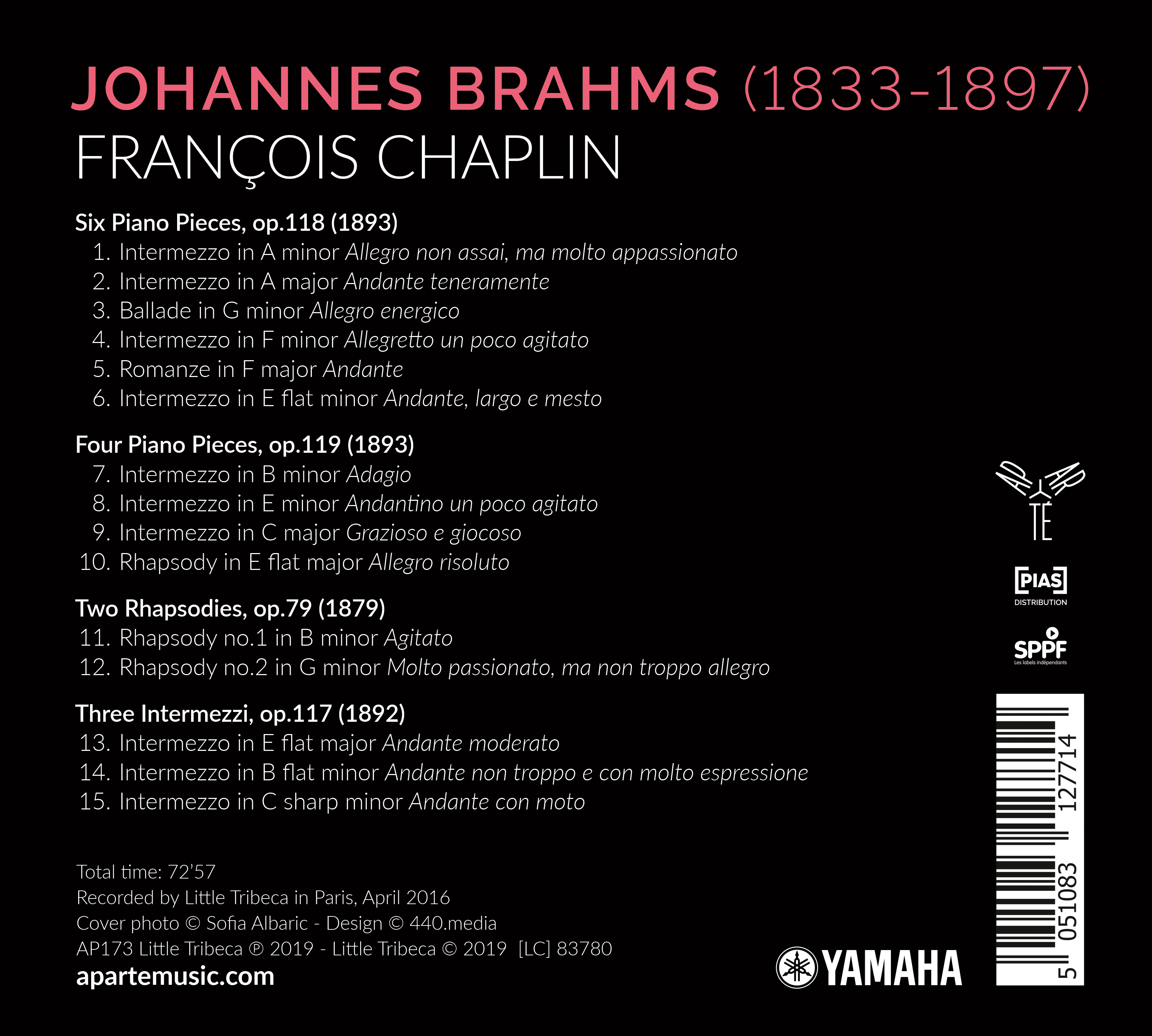 Après un disque consacré à Mozart, François Chaplin se tourne vers les derniers opus pour piano seul de Brahms : les Rhapsodies, op. 79 et les intermezzi des Klavierstücke, op. 117 et 118.