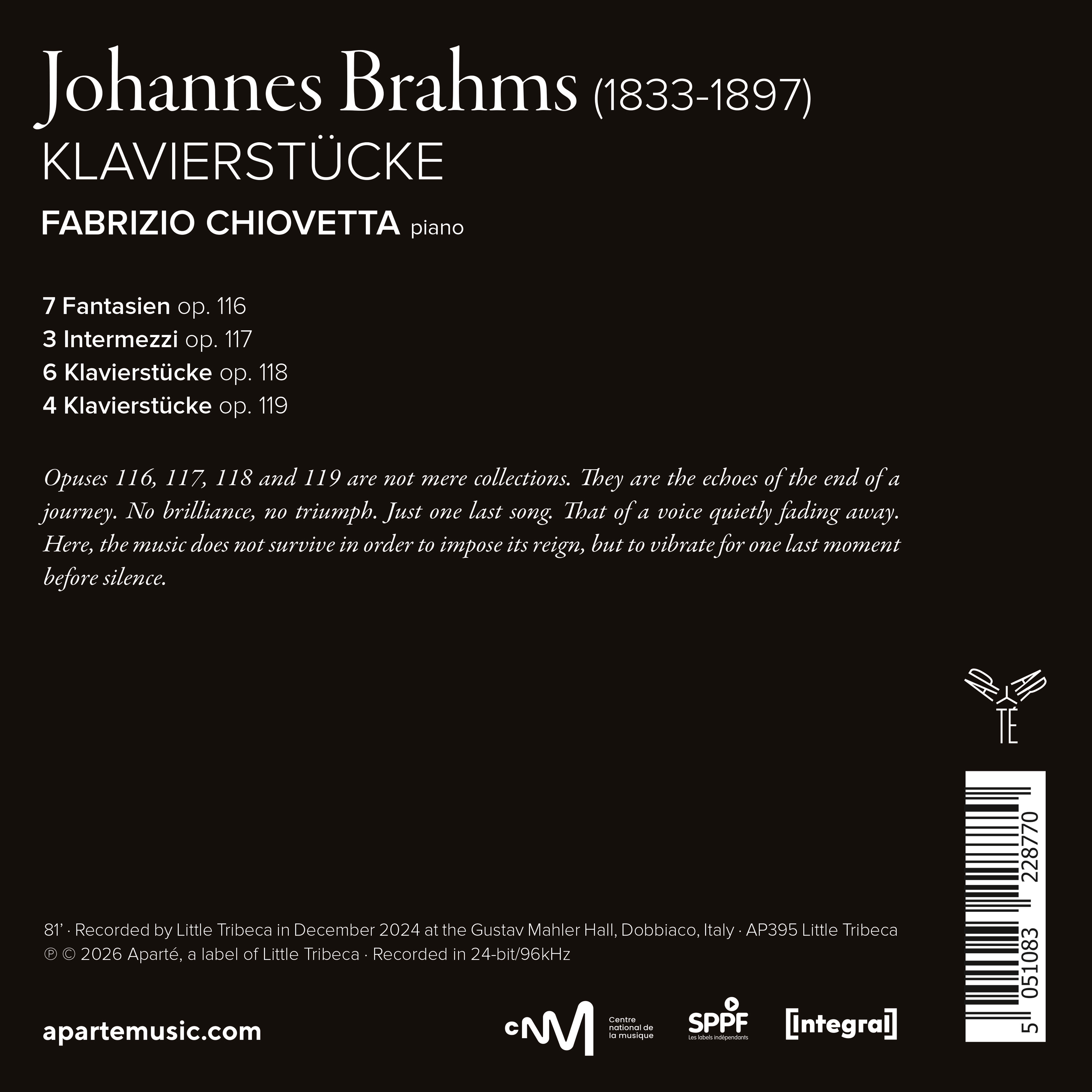 En 1892, Brahms revient au piano pour livrer ses ultimes pages pour l’instrument : quatre recueils à l’écriture dépouillée, presque ascétique, avant les Vier Gesange qui clôtureront son œuvre. “Jouer un intermezzo du Brahms tardif, c’est comme marcher dans la neige : la moindre trace reste.” Fabrizio Chiovetta embrasse ces chants du départ sans détour, avec l’élégance qui est la sienne.