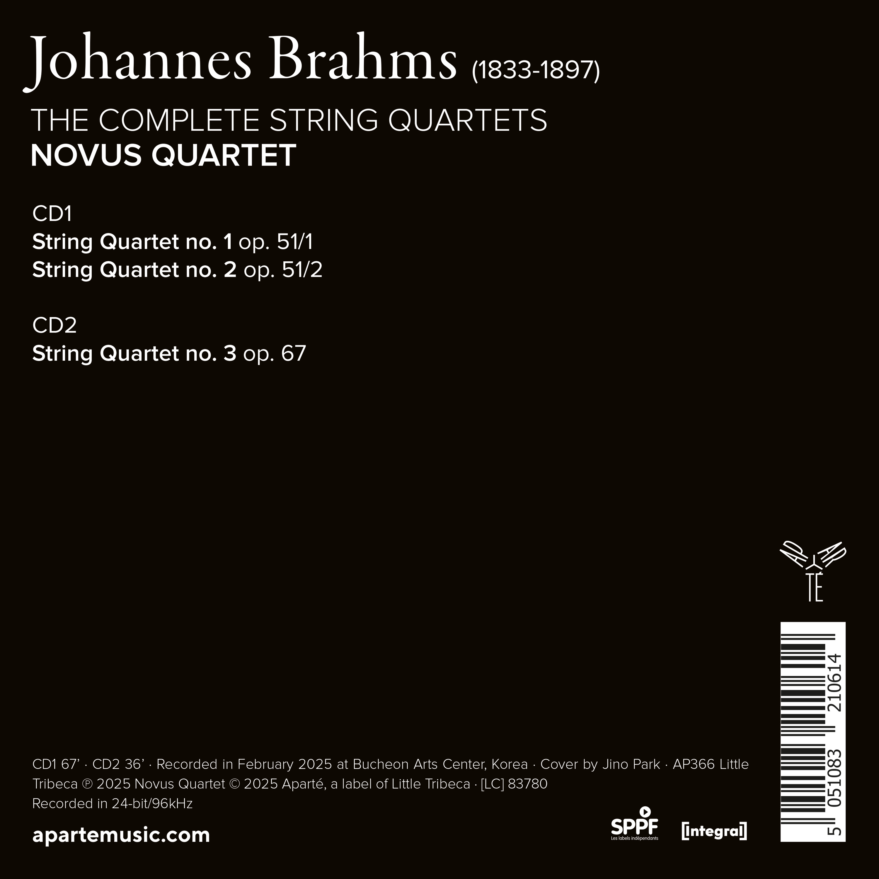 Fruits d’une longue gestation, les trois quatuors à cordes de Brahms arrivent tardivement dans la carrière du compositeur, que le poids de l’héritage de Beethoven a longtemps fait douter. Lauréat de l’ARD Munich et du Concours Mozart, le Novus Quartet s’est imposé comme l’un des tout meilleurs ensembles coréens, et définitivement l’un des plus intéressants, s’aventurant dès ses débuts chez la Seconde École de Vienne, Franck, Chostakovitch et Schubert. Dans Brahms, leur sonorité transparente, épurée, se conjugue à un engagement total, un lyrisme incisif et passionné qui sert magnifiquement le sens de l’architecture sans pareille du compositeur