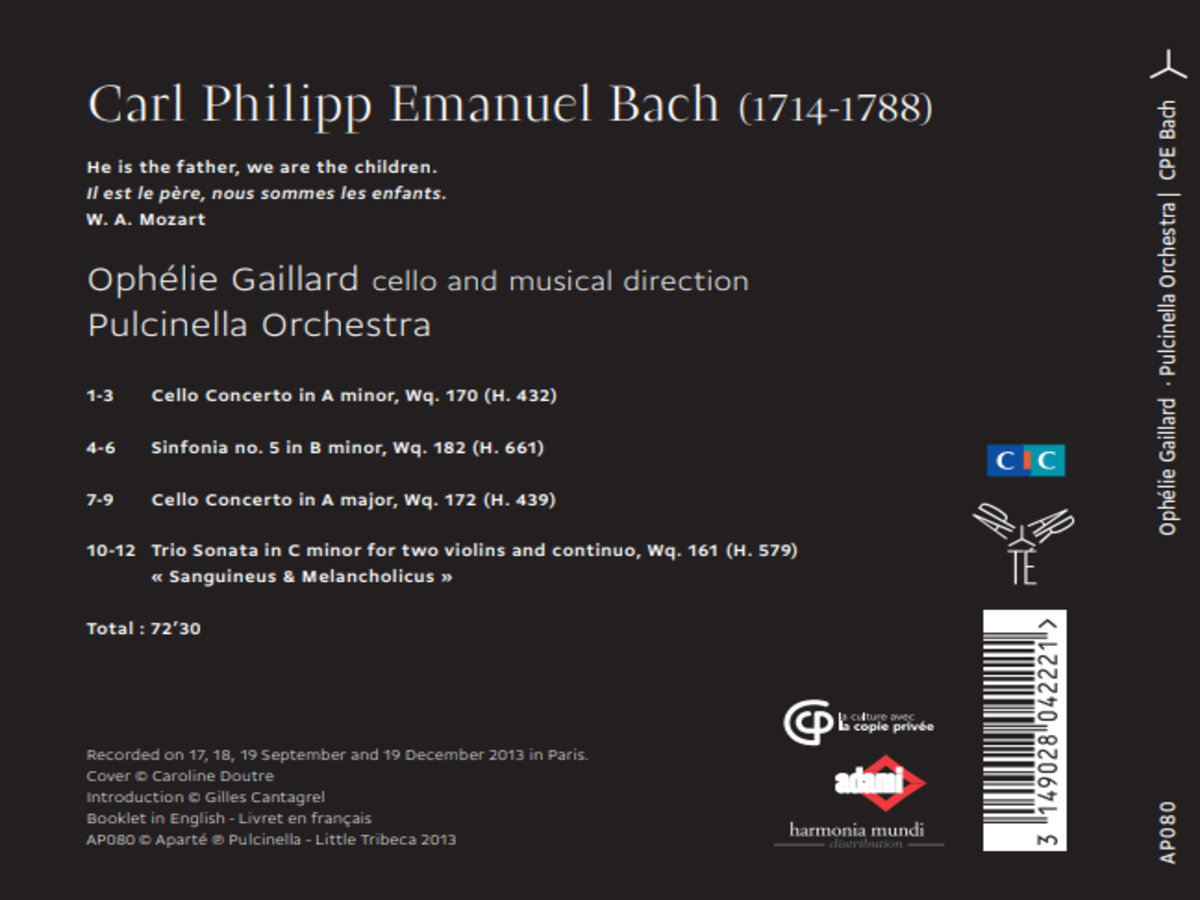 Ce programme propose un portrait du fils le plus doué et le plus surprenant de Jean-Sébastien Bach dont on fêtera le tricentenaire en 2014, Carl Philipp Emanuel Bach (1714-1788). Tenu en haute admiration en son propre siècle par Haydn, Gluck et Mozart, il nous apparaît de nos jours comme un génie totalement original. « Un musicien ne peut émouvoir les autres que s'il est lui-même ému : il est indispensable qu'il éprouve tous les états d'âme qu'il veut susciter chez les auditeurs. Aux endroits langoureux et tristes, il deviendra langoureux et triste ; cela devra s'entendre et se voir. » Par ces propos, Carl Philipp Emanuel Bach affirme sa vision de la musique qui se veut l'expression de sentiments personnels. Il n'hésite pas pour cela à révolutionner les principes établis sur la forme, l'harmonie, le rythme, par des changements brusques de tonalité, des carrures impaires, des contrastes vigoureux et inattendus, propices à émouvoir le public de manière directe. Dans la Sonate Sanguineus et Melancholicus, musique à programme, il représente une conversation entre un personnage Sanguin et un Mélancolique comme une sorte d'analyse psychologique d'une double personnalité. Cette dualité traverse toutes les ouvres de cet enregistrement de l'incroyable Sinfonia n. 5, tube parmi les tubes, aux deux chefs d'ouvres que sont les concertos pour violoncelle. La musique révolutionnaire de CPE Bach nous transporte et tournoie en mille et une émotions ! La symphonie, les deux concertos, et la sonate en trio, sonnent sous l'archet engagé d'Ophélie Gaillard à la tête de son ensemble de virtuoses, comme une révélation !
