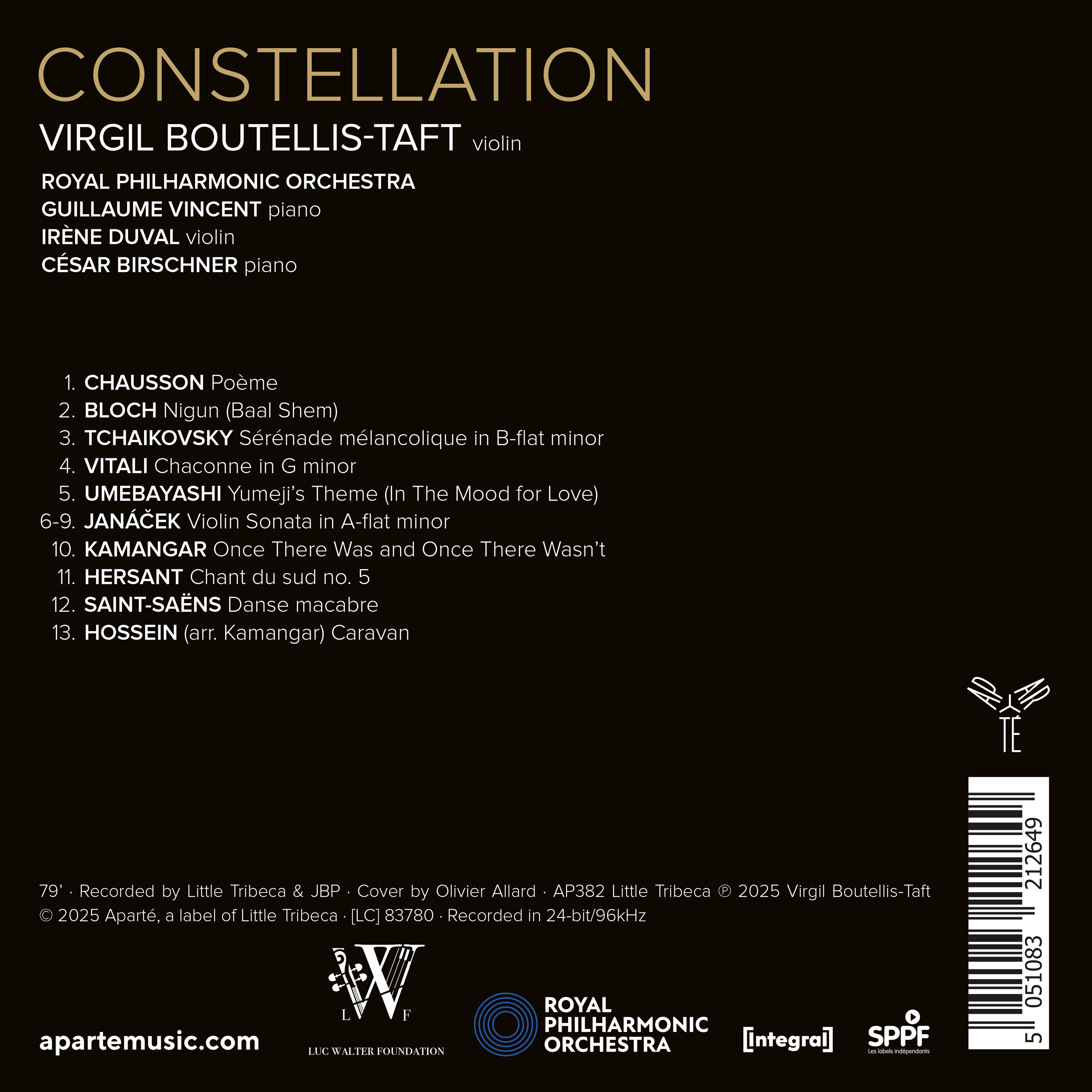 Avec ‘Constellation’, Virgil Boutellis-Taft nous rappelle que la musique constitue « l’une des plus belles façons de voyager ». Dans un programme nourri de ses nombreuses influences, le violoniste mêle les grands jalons du répertoire pour son instrument (le Poème de Chausson, la Sonate de Janacek ou bien la Danse macabre, arrangée ici pour deux violons) à des miniatures, témoignage d’une carrière marquée par des concerts aux quatre coins du monde et une admiration profonde pour Yehudi Menuhin. La compositrice Tara Kamangar y côtoie ainsi Philippe Hersant, André Hossein ou Ernest Bloch – autant de points cartographiant, en filigrane, les sources d'inspiration d’un violoniste voyageur.