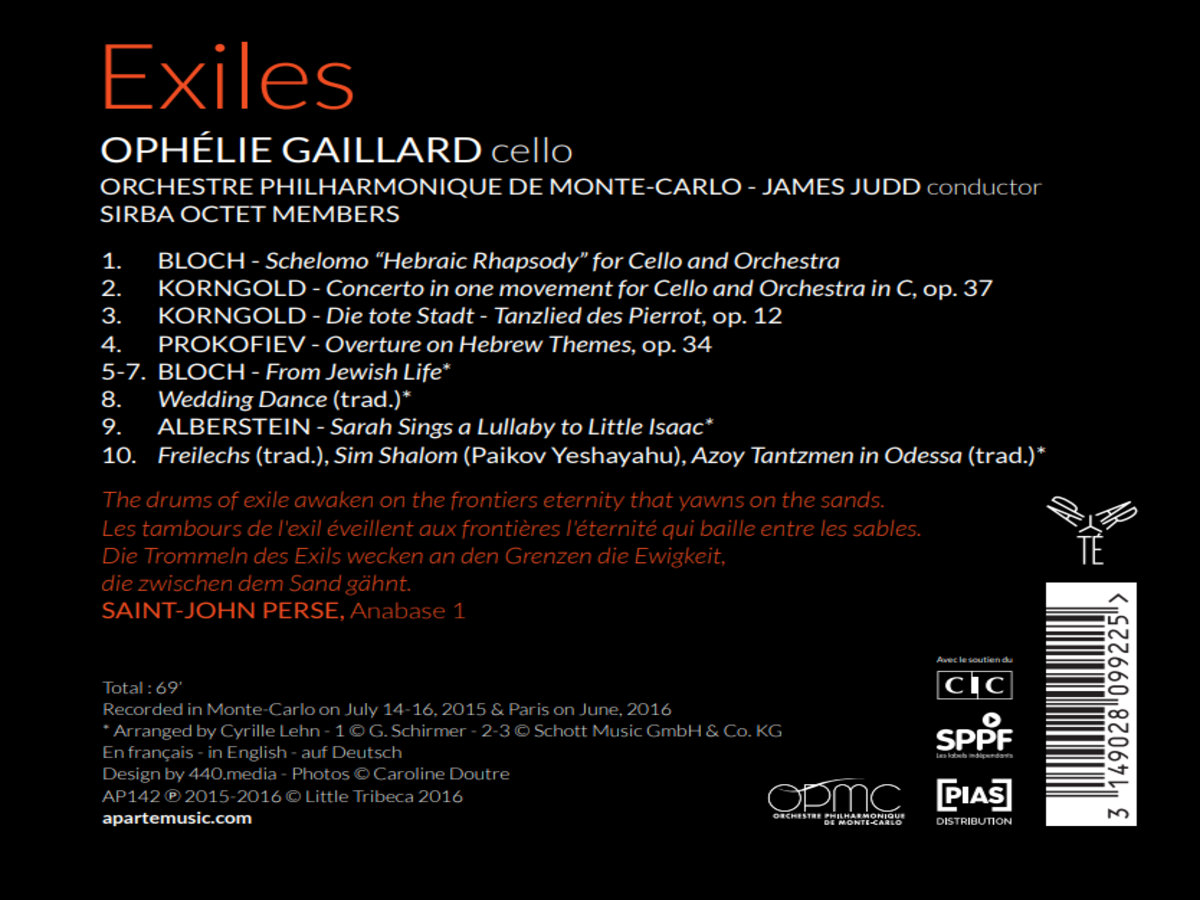 Après Alvorada, son violoncelle voyageur nous conduit sur les pas de Bloch, Korngold, Prokofiev, de Chava Alberstein et Giora Feidmann, nous chante leur exil, subi ou délibérément choisi, et nous fait vibrer au son d'une musique de film (Concerto de Korngold), d'une prière (From Jewish Life), d'un récit hébraïque (Schelomo), d'une berceuse, d'une danse de mariage... L'esprit de fête, la tendresse, le recueillement religieux, autant de facettes de la vie quotidienne et de la culture de plusieurs générations de migrants juifs contés par l'archet humaniste d'Ophélie Gaillard.