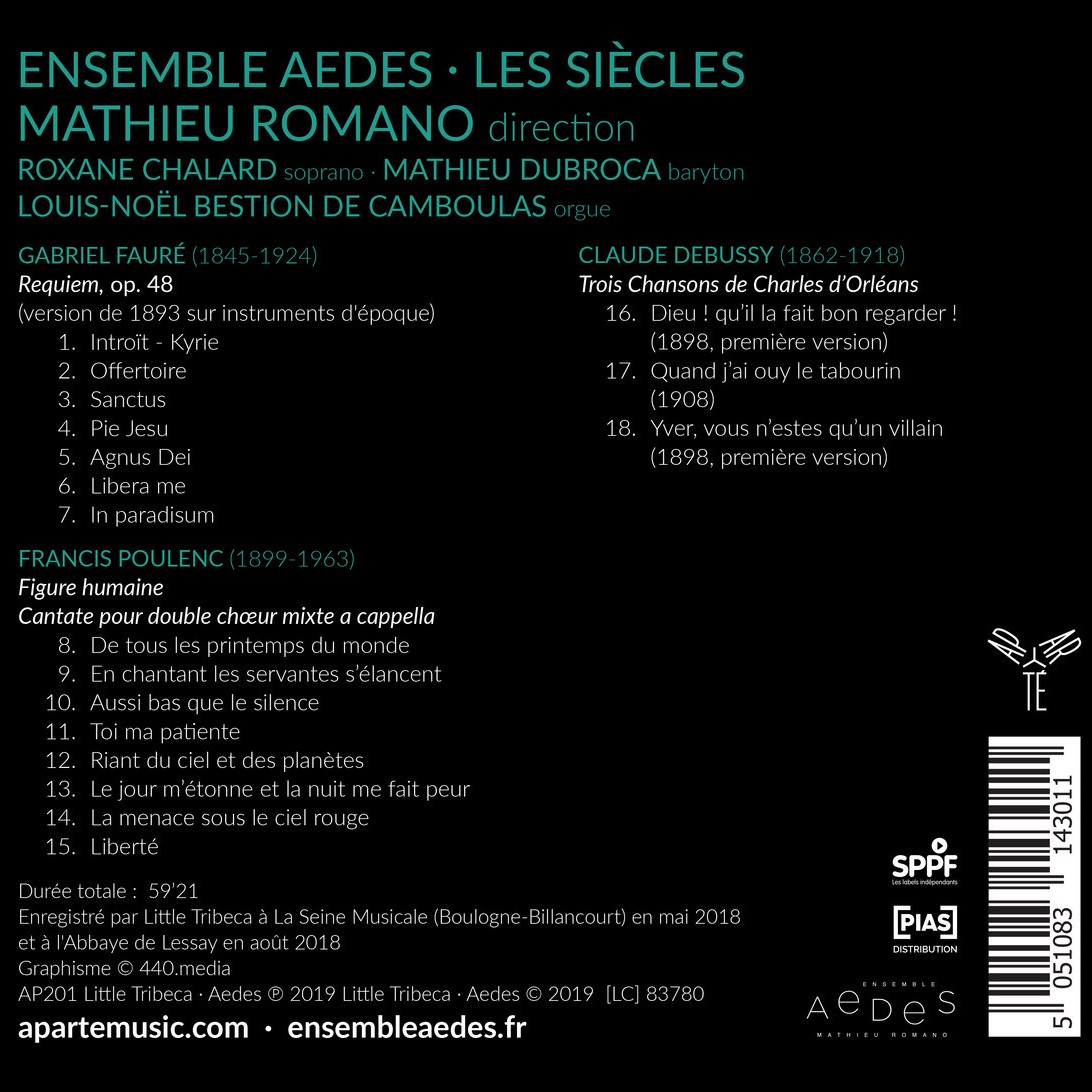 Un casting 100% français pour un disque de musique 100% française, et une triple redécouverte. Écrit pour le plaisir, le Requiem de Fauré offre une poésie douce et des instants de recueillement confiés tant au chœur qu’aux deux solistes vocaux. Soucieux de restituer l’œuvre aussi fidèlement que possible à sa première exécution, l’Ensemble Aedes et Les Siècles sous la baguette de Mathieu Romano livrent ici le Requiem dans son orchestration originale de 1893, sur instruments d’époque, et avec prononciation du latin à la française comme à l’époque de la création. L’articulation exceptionnelle des chanteurs d’Aedes épouse ensuite à merveille Figure humaine. On n’a jamais entendu si distinctement le texte de ces poèmes d’Éluard mis en musique par Poulenc ! Les Trois Chansons de Debussy referment avec élégance le disque. Ici encore, on est sidéré par la qualité et la clarté du matériau vocal. Mathieu Romano, directeur artistique et fondateur d’Aedes s’impose en magicien des voix, tout à la fois puissantes et intimes dans les partitions a cappella, et consolatrices dans leur mariage avec les cordes des Siècles. Indispensable !