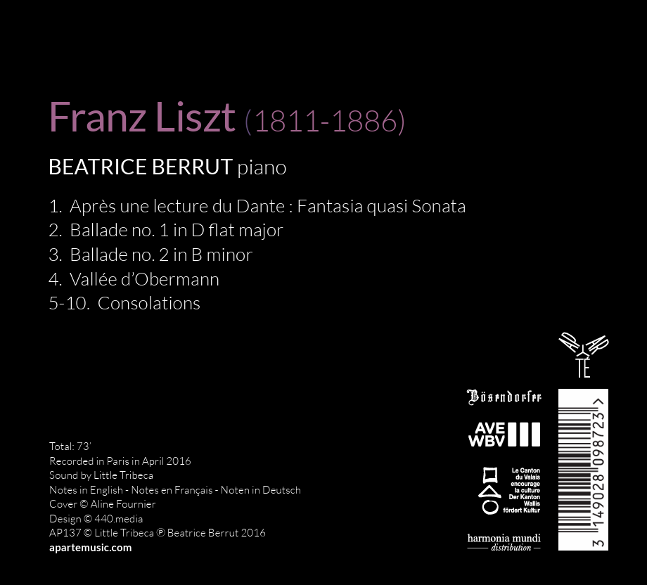 Dans sa vie comme dans son œuvre, la musique de Liszt représente une lutte stylisée entre le bien et le mal, la lumière et les ténèbres. Son écriture, que l'on peut parfois qualifier de manichéenne, explore pourtant toutes les douleurs et les joies que peut connaître l'âme humaine et crée un lien indéfectible entre des sentiments très éloignés les uns des autres. La metanoia de Liszt : son chemin courageux vers la lumière et la sérénité, offre l'exemple touchant et libérateur d'un homme qui a assumé ses passions dévorantes et les a sublimées dans les œuvres qu'il a créées. Une lecture intime de l'âme de Liszt par la pianiste suisse Béatrice Berrut, enregistrée à Paris par Nicolas Bartholomée sur un piano Bösendorfer en avril 2016.