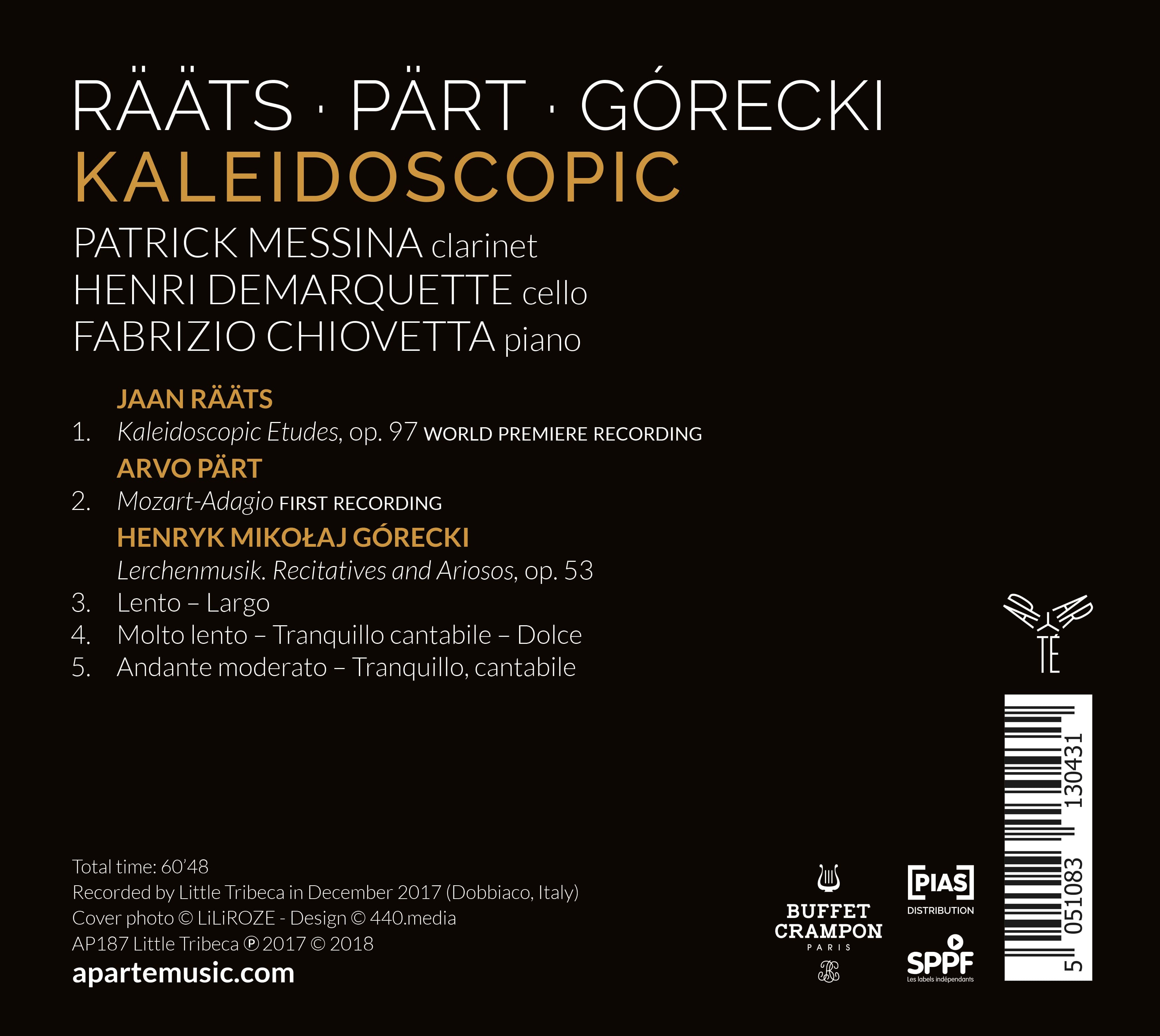 Le pianiste Fabrizio Chiovetta et le clarinettiste Patrick Messina quittent l’univers schumannien de leur précédent opus pour explorer avec le violoncelliste Henri Demarquette les partitions d’Arvo Pärt et des moins connus mais non moins sensibles Jaan Rääts et Henryck Górecki. Le premier des trois, inspiré par l’une des œuvres les plus touchantes de Mozart (l’Andante amoroso de la sonate pour piano, K.281), propose ici un arrangement inédit. Remplaçant le violon par la clarinette, Arvo Pärt colore cette délicate conversation à trois du timbre subtil et velouté de l’instrument à vent. ".