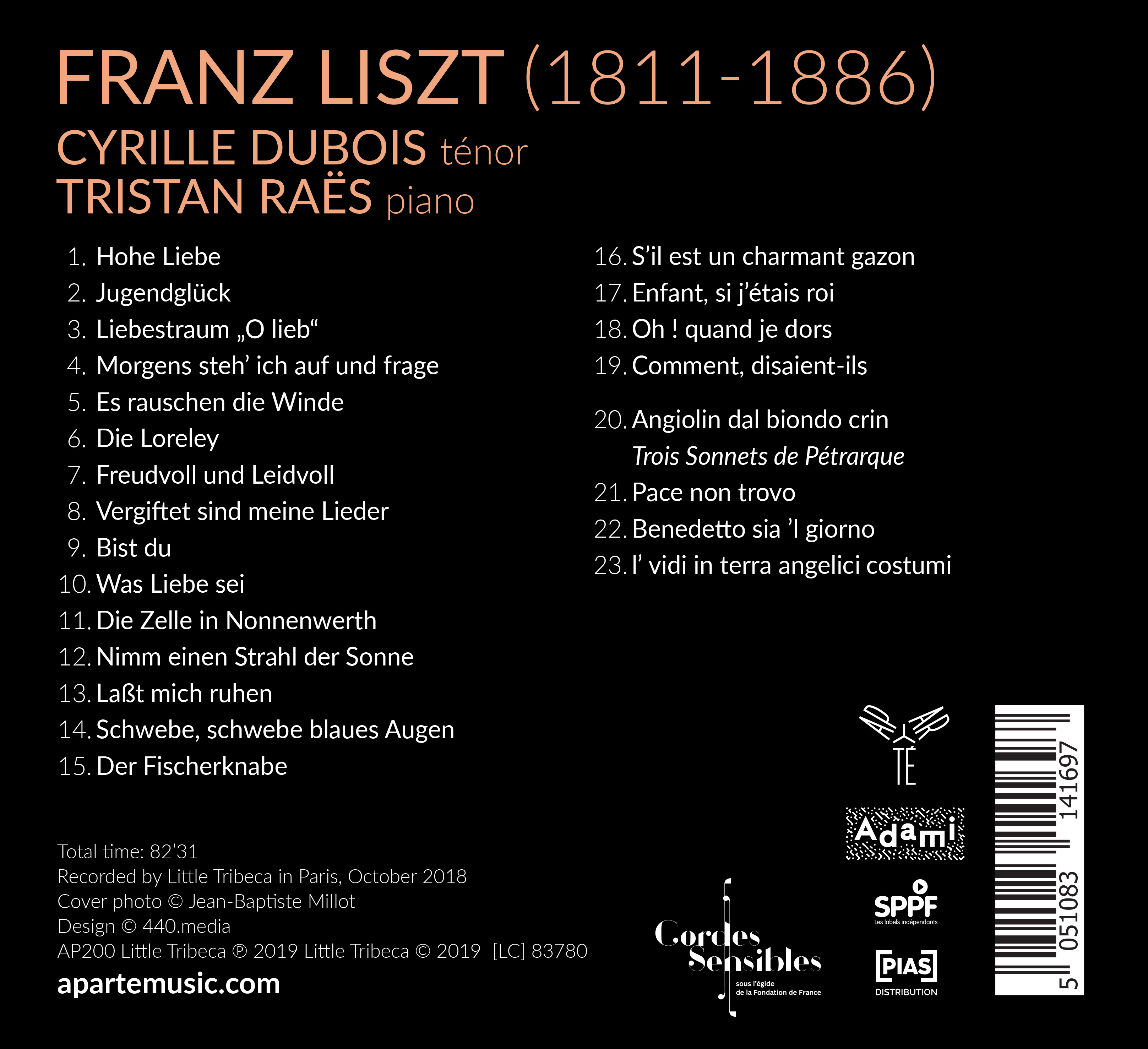 Le duo qu'il constitue avec le pianiste Tristan Raës propose pour ce premier album chez Aparté un bouquet de Lieder et de mélodies de Franz Liszt. Redoutable pour les interprètes, ce répertoire de l'intime est défendu avec sincérité évidente par les deux musiciens-amis, coiffés de nombreuses récompenses et liés par une complicité musicale de plus de dix années, dans les pages vocales allemandes (Schumann et Schubert) ou la mélodie française.