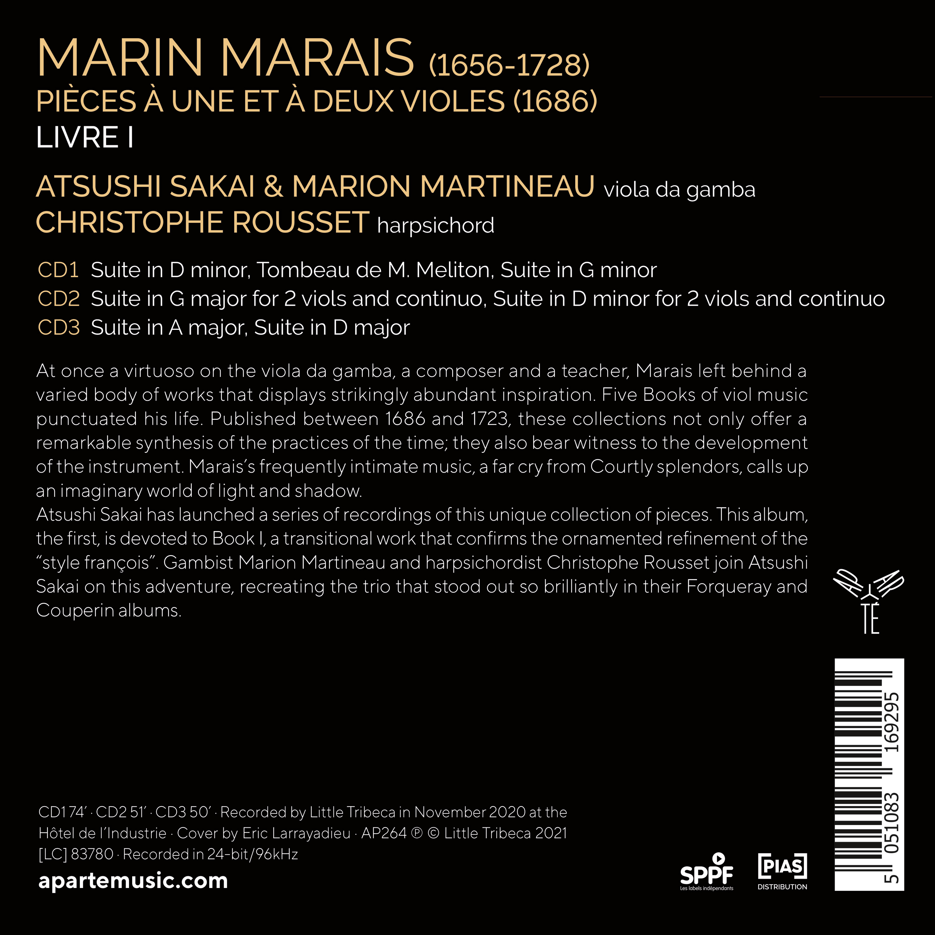 Atsushi Sakai consacre une série discographique à cet ensemble singulier, dont le présent enregistrement constitue un premier volet articulé autour du Premier livre, ouvrage de transition qui consacre le raffinement du style français. Atsushi Sakai s’entoure pour cette aventure de la violiste Marion Martineau et du claveciniste Christophe Rousset, trio déjà brillamment distingué dans ses parutions consacrées à Forqueray et Couperin.