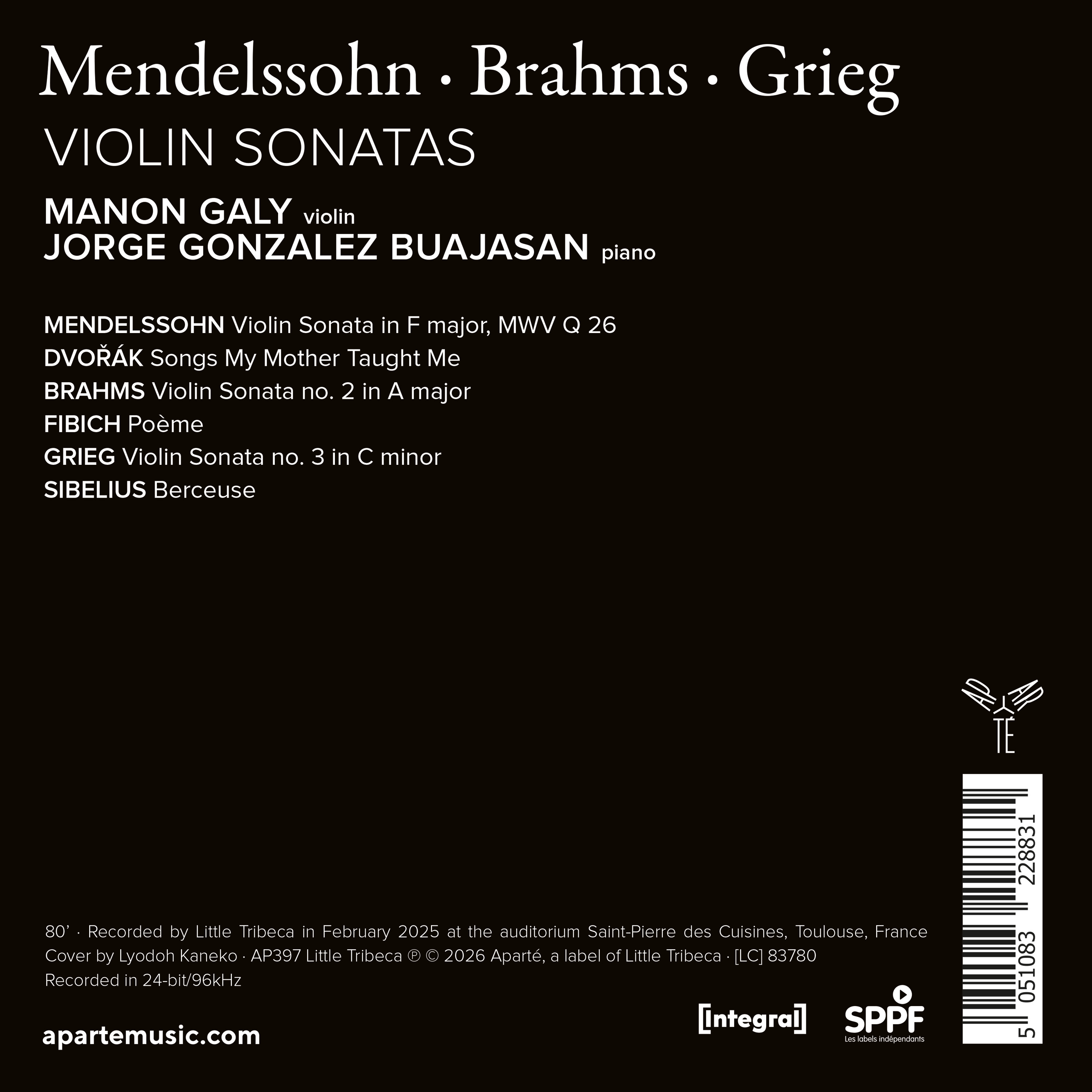 Après ‘Nuits parisiennes’, Manon Galy et Jorge Gonzalez Buajasan ouvrent la porte sur les mondes intérieurs du romantisme. Autour de la rare Sonate en fa majeur MWV Q 26 de Mendelssohn (la seule de sa maturité), la deuxième de Brahms et la troisième de Grieg, gravitent quelques bijoux de poésie et d’intimité, comme la ‘Berceuse’ de Sibelius ou le ‘Poème’ de Fibich. Entre valses mélancoliques et langoureux vertiges, violon et piano se font ici la voix tantôt exaltée, tantôt nostalgique des confidences des compositeurs.