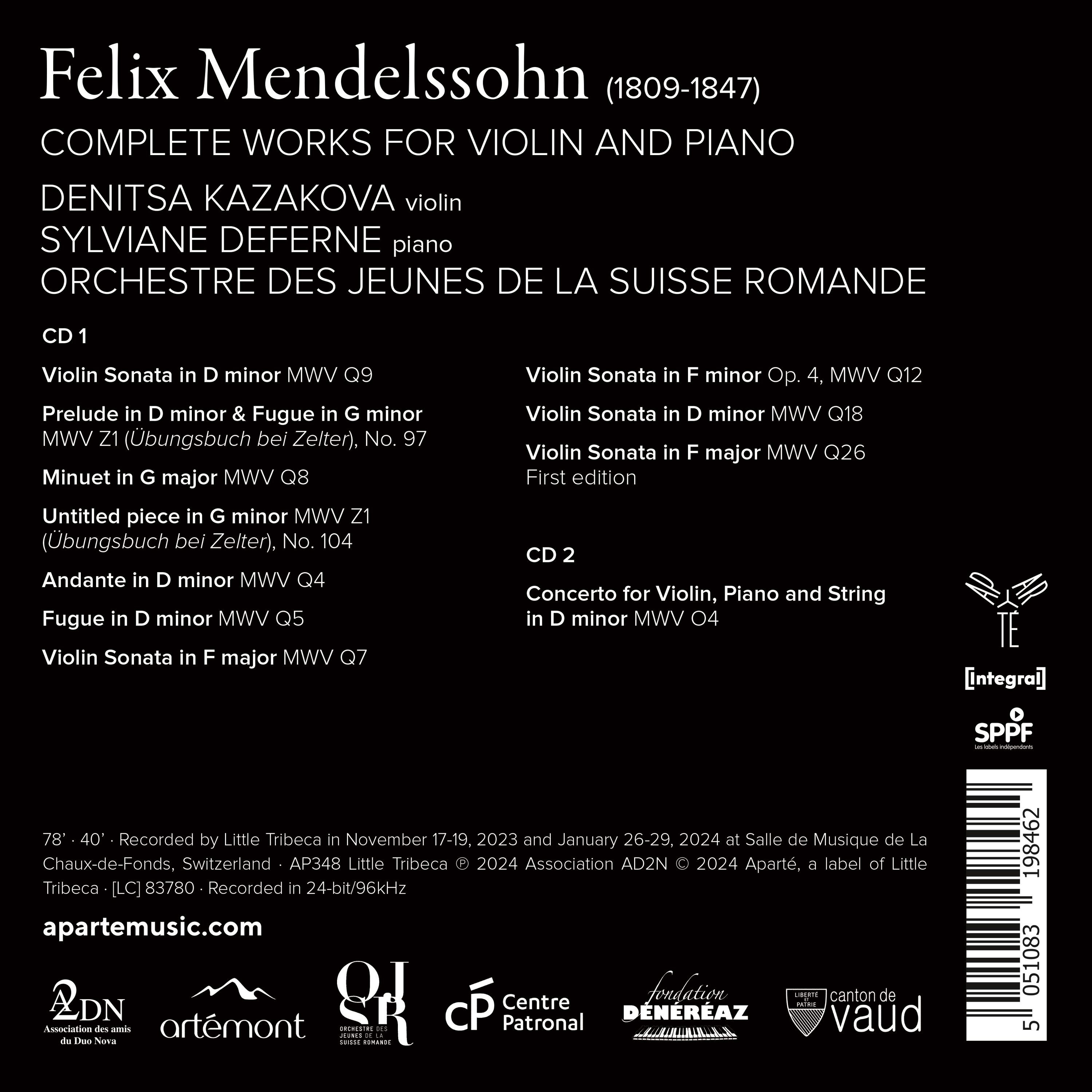 Denitsa Kazakova et Sylviane Deferne enregistrent ici la première intégrale des oeuvres pour violon et piano de Mendelssohn, incluant notamment un Andante inédit, ainsi que son Concerto pour violon et piano, composé à l'âge de 14 ans.