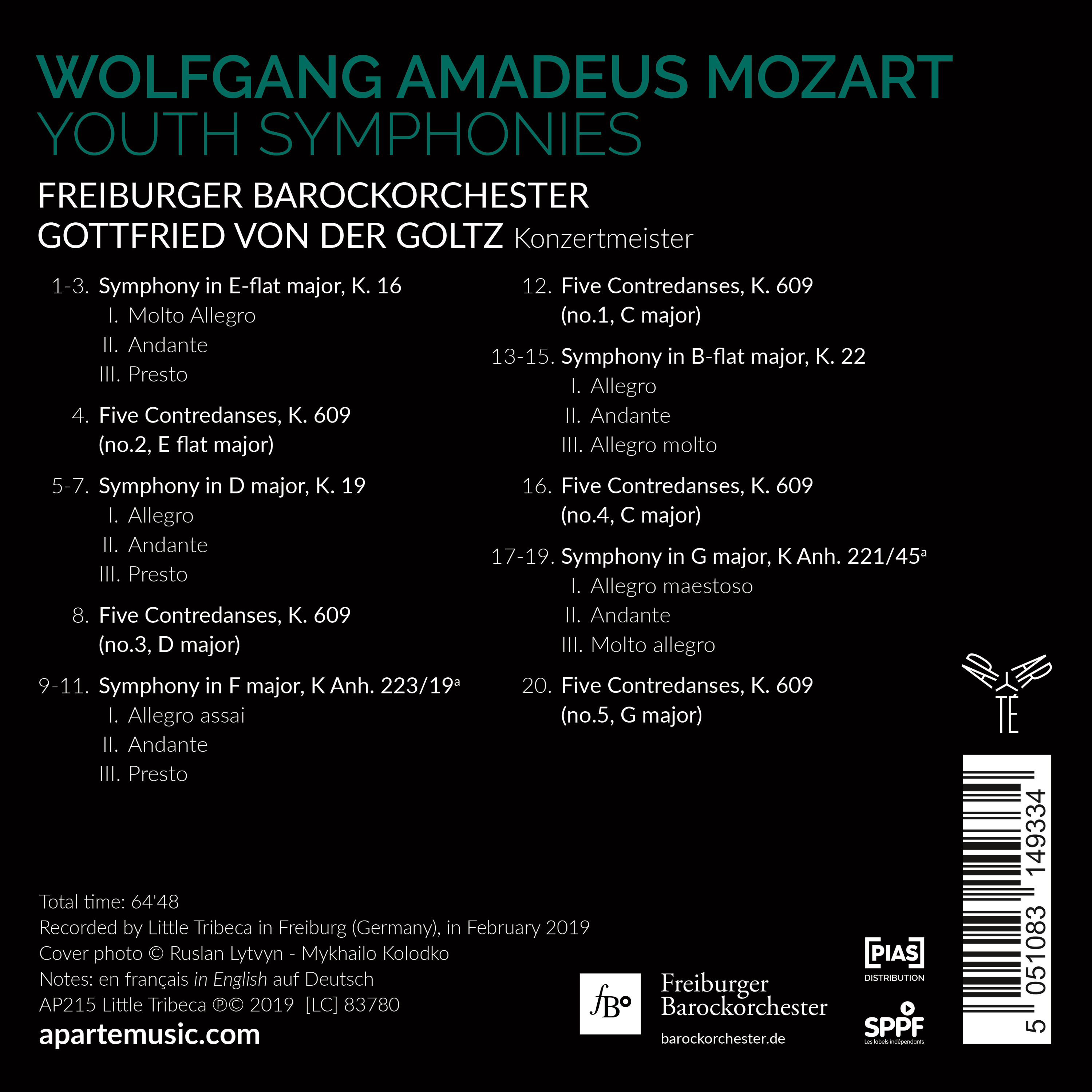 Les premiers essais symphoniques de l’enfant Mozart dépassent la simple curiosité lorsqu’on les regarde de près, comme le fait remarquer le musicologue Henning Bey, auteur des textes accompagnant ce nouvel enregistrement. Il démontre comment le jeune garçon, sans la présence de son père alité, se débrouille pour jeter sur le papier sa toute première symphonie après quelques essais pour le clavier et pour le violon. Le manuscrit porte encore les traces des interrogations du jeune compositeur et des difficultés rencontrées avec l’encre et une plume mal taillée. C’est ainsi que l’on apprend que « la forme se développe à partir du contenu » dès ce premier essai orchestral. C’est par l’écriture de menuets que Mozart est initié à la composition par son père. Et c’est précisément par la danse qu’il terminera son oeuvre, composant les Cinq Contredanses, K. 609 quelques jours avant sa mort pour les bals impériaux à la Redoute. Elles sont présentées ici, comme pour boucler la boucle, entre chacune des cinq symphonies de jeunesse qui forment la substance de cet album. L’excellence de l’interprétation de Gottfried von der Goltz, et des musiciens du Freiburger Barockorchester qu’il dirige de son violon, jette un regard d’adulte sur cette musique d’enfance, avant que le voyageur Mozart ne s’imprègne de tout ce qu’il voit et entend pour élaborer son singulier langage. Le plus troublant est la sûreté d’écriture d’un enfant de 8 à 9 ans, qui semble déjà parfaitement savoir où il va et qui il deviendra.