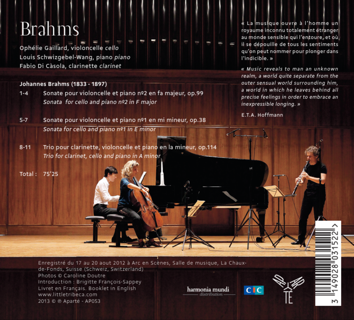 Ophélie Gaillard marque les esprits à chacun de ses enregistrements, de Dreams aux Suites de Bach, encensées par la critique, en passant par Bach Arias avec son ensemble Pulcinella, elle ne cesse de renouveler les genres par la perfection de ses interprétations. Elle nous offre ici, accompagnée de solistes de haut rang, Louis Schwizgebel-Wang et Fabio Di Càsola, un disque Brahms, d'une intensité rare. Deux monumentales sonates et un trio avec clarinette, de glorieux moments où le violoncelle chante comme lui seul sait le faire ; lyrisme sublimé sous l'archet d'Ophélie Gaillard.