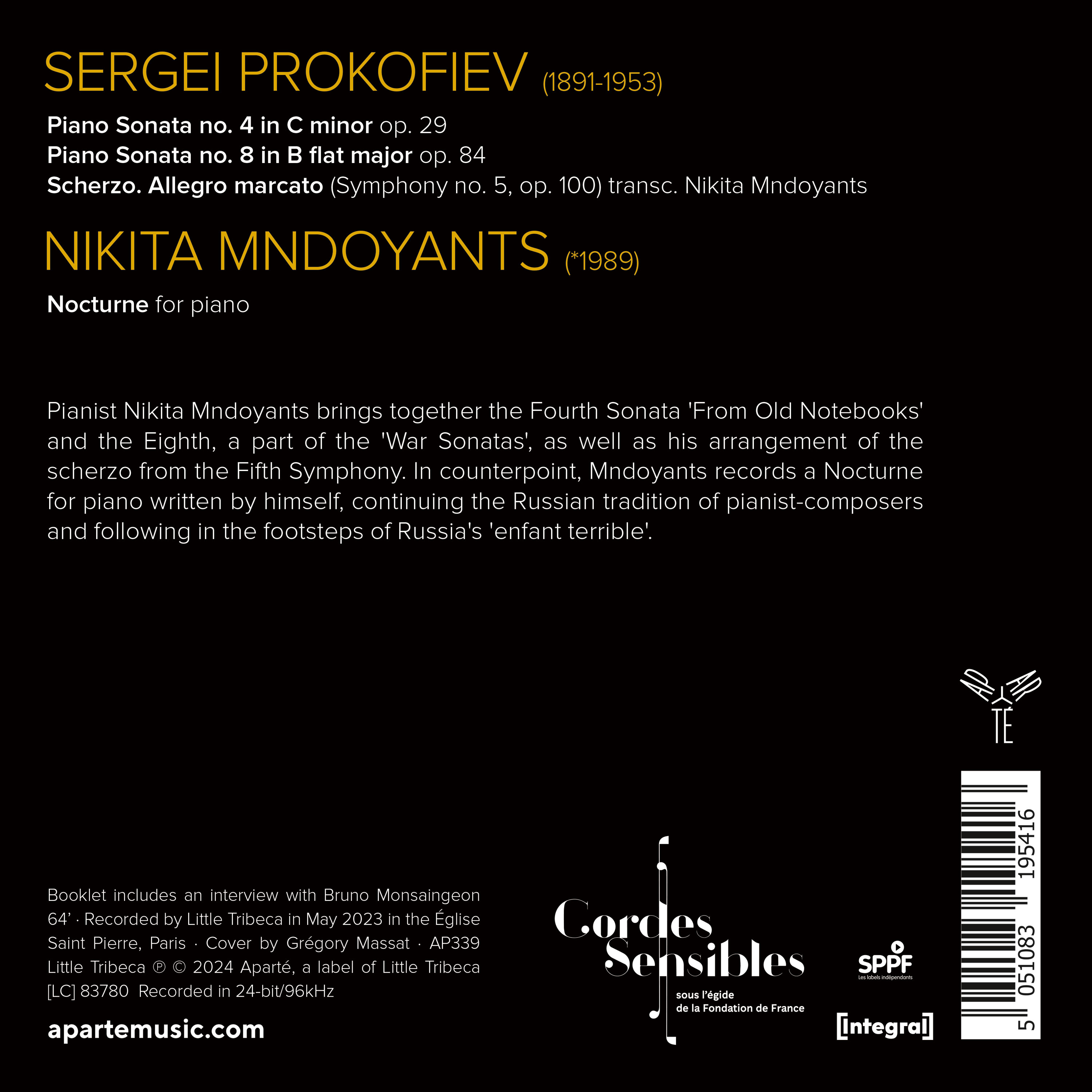 Le pianiste Nikita Mndoyants consacre cet enregistrement à Prokofiev, dont la musique l’accompagne depuis ses débuts. Il réunit ici la Quatrième Sonate “d’après de vieux cahiers” et la Huitième, partie intégrante des sonates dites “de guerre”, ainsi qu’un arrangement du scherzo de la Cinquième Symphonie. Nikita Mndoyants donne ainsi à apprécier les différentes facettes du compositeur, et à mesurer la richesse d’un langage où se mêlent virtuosité exceptionnelle, sens de la féérie et ironie mordante.