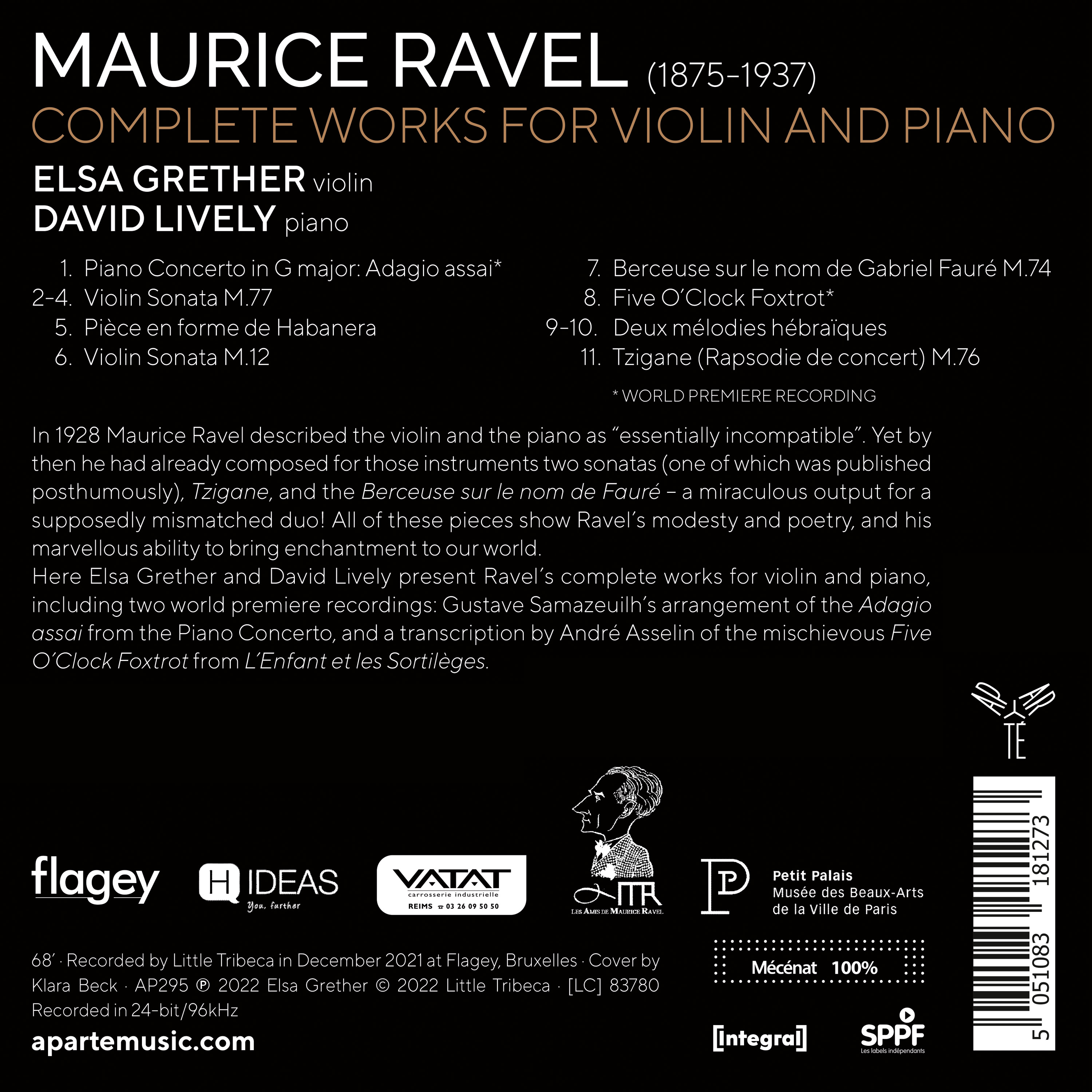 Elsa Grether et David Lively enregistrent ici l’intégralité de ces oeuvres pour violon et piano, avec deux premières mondiales : un arrangement de Gustave Samazeuilh de l’Adagio assai du Concerto pour piano, et une transcription d’André Asselin du malicieux Five o’Clock Foxtrot tiré de L’Enfant et les Sortilèges.