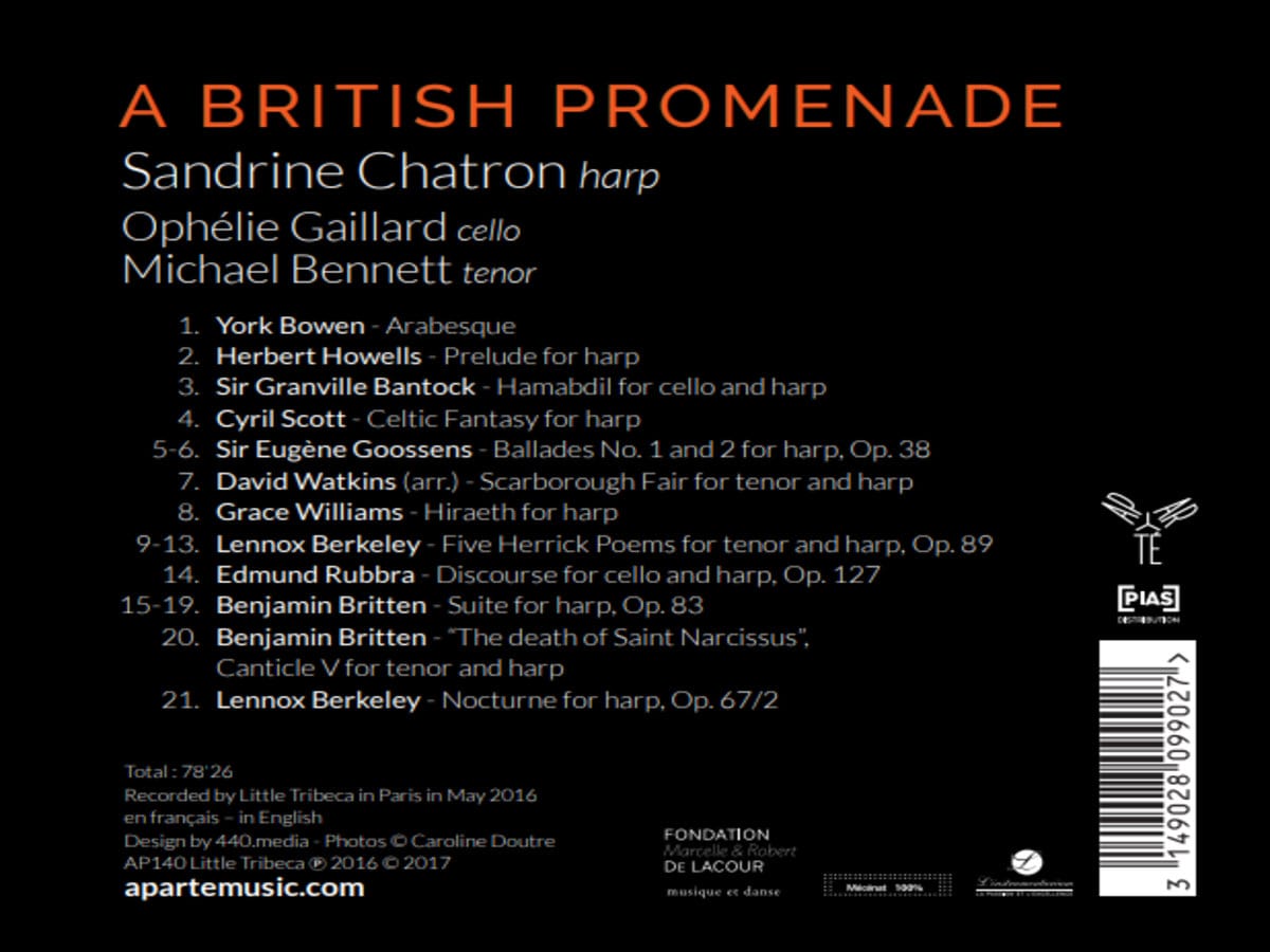 "Comme le titre de son nouveau disque A British Promenade l'indique, la harpiste Sandrine Chatron nous propose une flânerie musicale dans l'Angleterre du début du XXe siècle. On y croise des compositeurs rares, comme Herbert Howells ou Cyril Scott, mais aussi Benjamin Britten. Les pages qu'ils composèrent pour la harpe nous transportent dans les paysages côtiers ou plus champêtres de nos voisins anglais. Leurs évocations sont également déclinées par le lyrisme du violoncelle d'Ophélie Gaillard et la chaleur de la voix du ténor Michael Bennett qui viennent enrichir la palette sonore de l'époque en faisant contrepoint à l'expression plus pointilliste de la harpe."