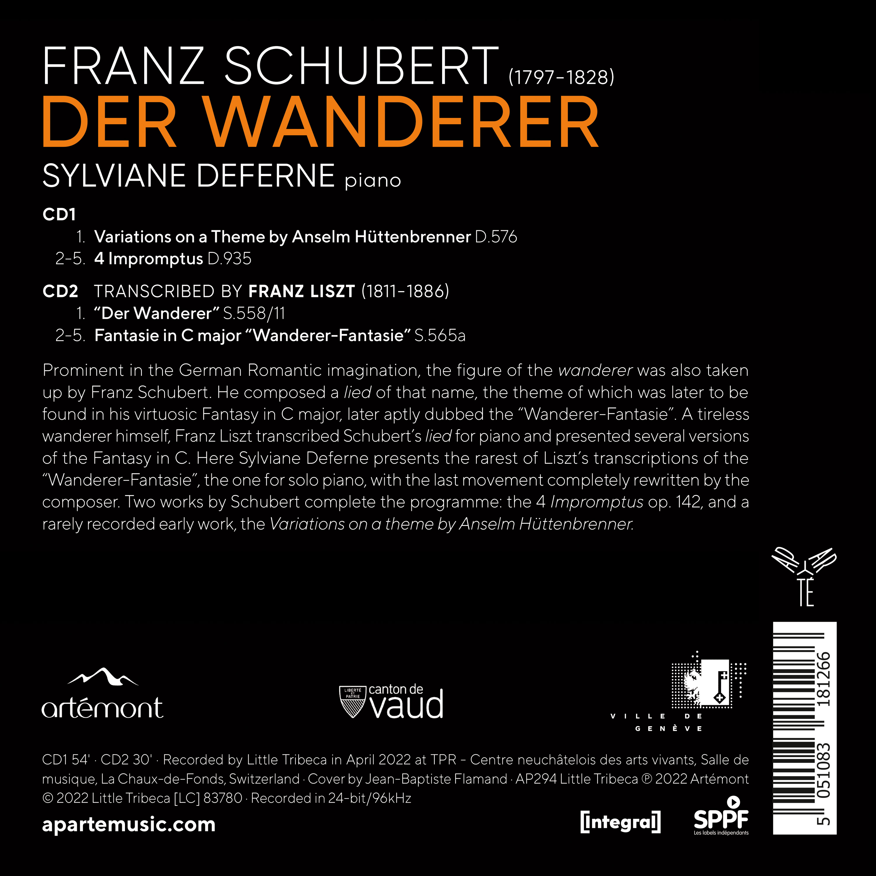 Sylviane Deferne enregistre ici la plus rare, pour piano seul et avec un finale complètement revisité. Cheminant sur les traces de Schubert, la pianiste complète cet album avec les quatre Impromptus op. 142, écrits un an avant la mort du compositeur, ainsi que les Variations sur un thème d’Anselm Hüttenbrenner, œuvre de jeunesse peu enregistrée.