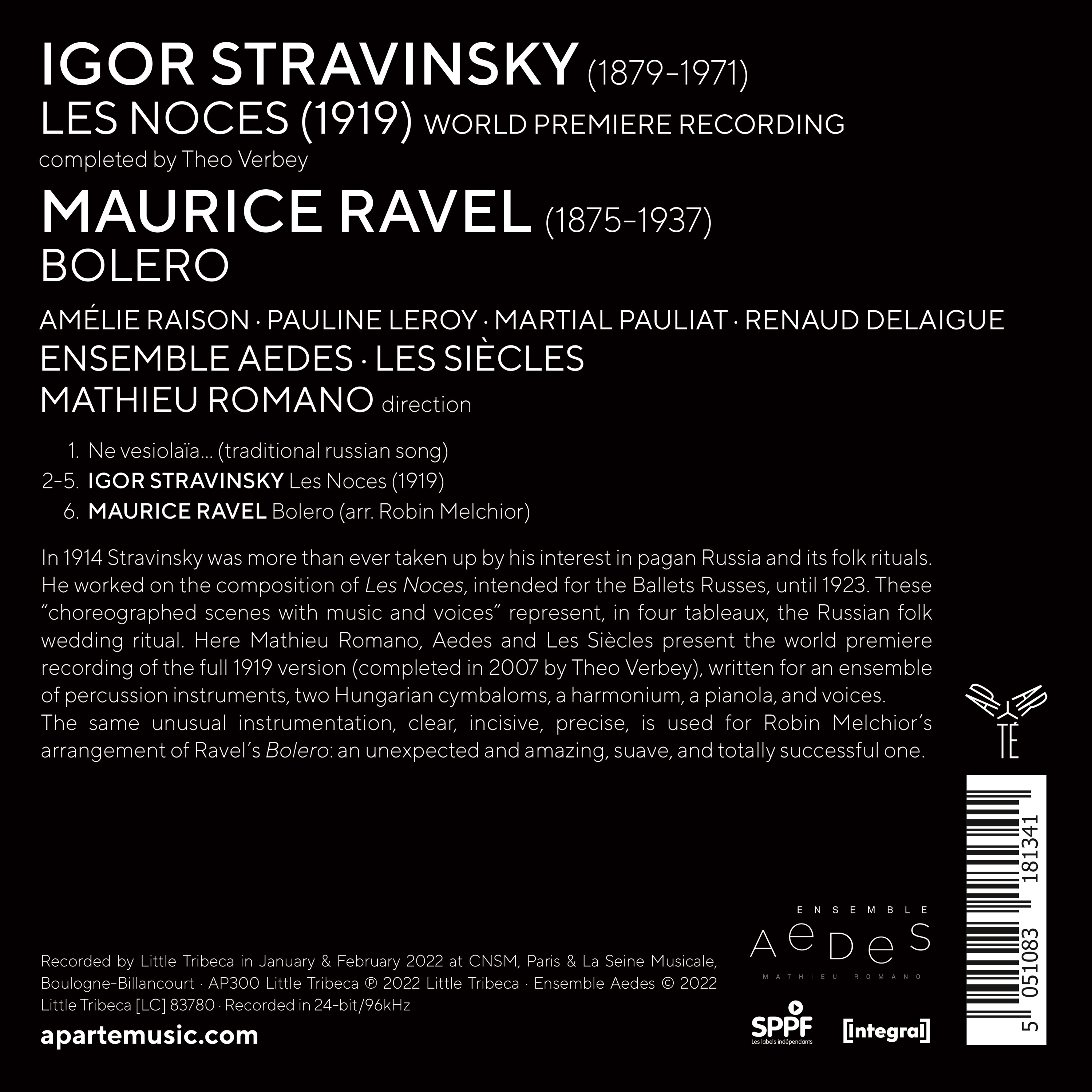 En 1914, Stravinski est plus que jamais occupé par la Russie primitive et ses traditions. Il s’attèle ainsi, jusqu’en 1923, à la composition des Noces, qu’il destine aux Ballets russes. Ces “scènes chorégraphiques avec chant et musique” représentent, en quatre tableaux, une cérémonie de mariage de la Russie paysanne. Sobre, stylisée, affûtée comme un rasoir, la musique de Stravinski conjugue brutalité rythmique et force incantatoire, rappelant le caractère à la fois éternel et inexorable du cérémonial nuptial. L'œuvre connut plusieurs essais d’instrumentations différentes. Mathieu Romano, l'Ensemble Aedes et Les Siècles enregistrent ici pour la première fois l’intégralité de la version 1919 (achevée en 2007 par Theo Verbey), destinée à un ensemble mêlant percussions, cymbalums hongrois, harmonium, pianola et voix.