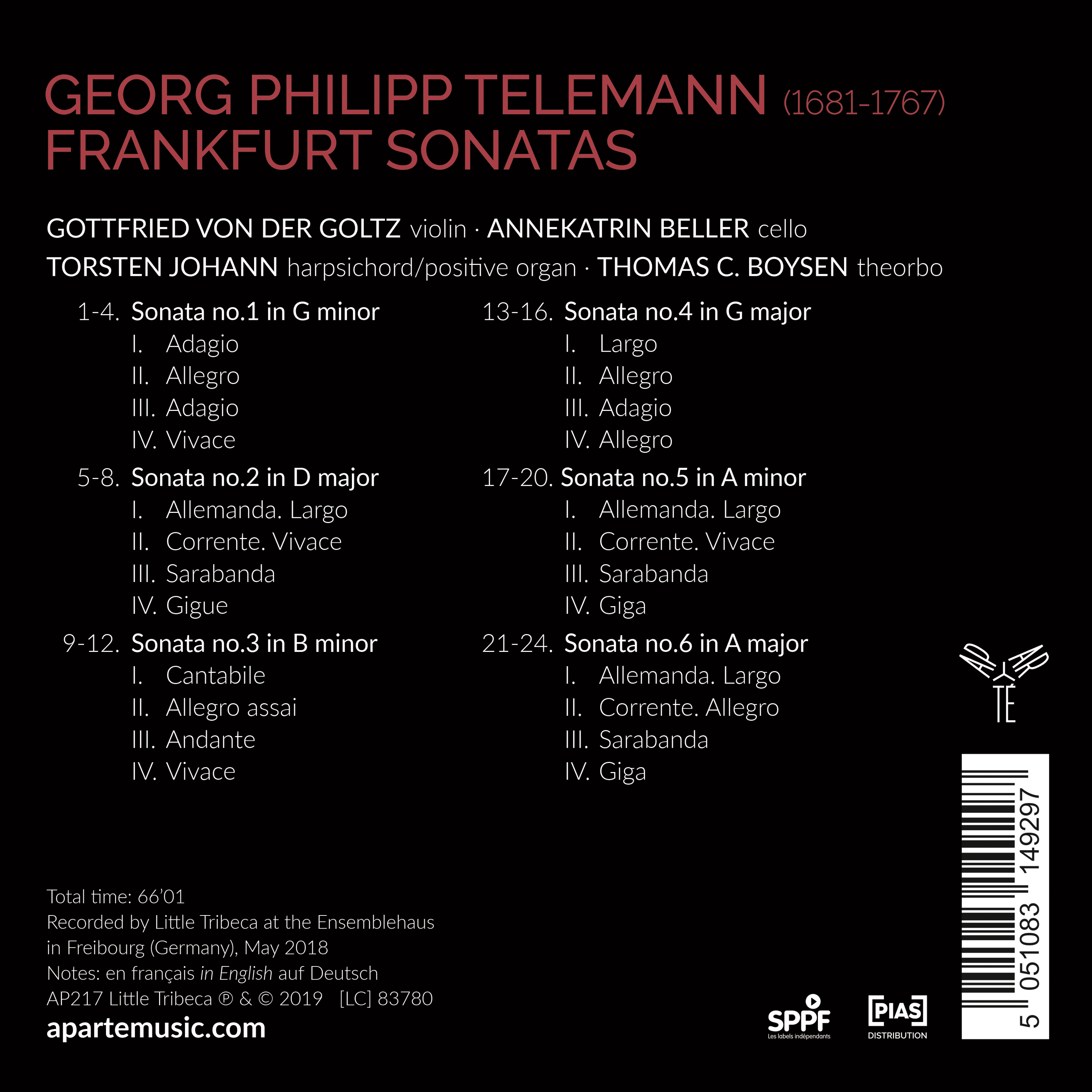 Gottfried von der Goltz, premier violon et chef de l’excellent Freiburger Barockorchester, revient pour un nouvel opus consacré aux sonates pour violon du jeune Telemann, à l'origine accompagnées au clavecin. Guère enregistrées, surprenantes dans leur forme, mais encore plus par la liberté de jeu et d’ornementation qu’elles offrent aux musiciens, ces sonates, publiées à Francfort en 1715, témoignent de l’exceptionnelle richesse créative déjà contenue dans l’œuvre de Telemann.